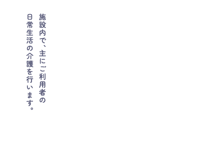 特別養護老人ホームやグループホーム、デイサービスなどの施設内で、主にご利用者の日常生活の介護(排泄介助、入浴介助、食事介助、口腔ケア等)を行います。ご利用者が、その人らしい、生き生きした生活ができることを目指します。