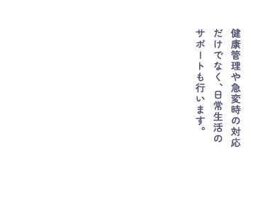 施設をご利用されている方の健康管理や急変時の対応だけでなく、日常生活のサポートも行います。バイタルチェックや服用管理、口腔ケア、食事介助、入浴介助、利用者の家族への対応、散歩や行事への参加など、仕事内容が多岐に渡ります。