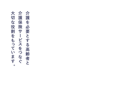 ケアマネジャー(居宅介護支援専門員)とは、介護を必要とする高齢者と介護保険サービスをつなぐ大切な役割をもっています。