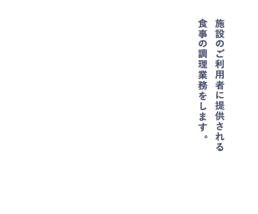 調理・配膳・片付けの他にもメニュー考案や食材の管理(発注や買い出しなど)を行う場合もあります。ご利用者に合わせた調理法(減塩、ペースト食、ソフト食、とろみ食、きざみ食など)が求められます。